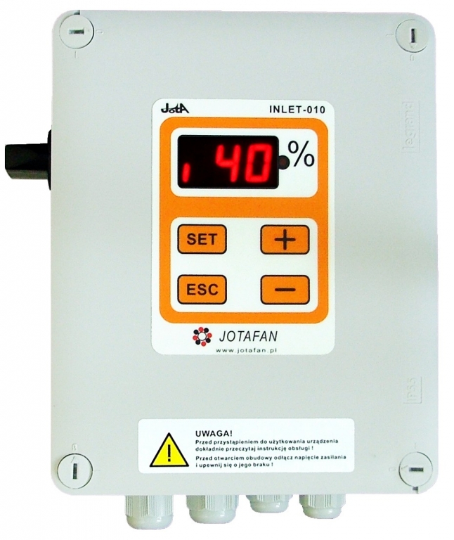Module INLET–010-2PK is an electronic controller used to control the servomotor’s work as for opening and closing the hopper-type windows. The servomotor’s operation is controlled by electromagnetic relays; one works as voltage connector (it turns on/off the servo-motor’s power supply) and the second one is used to choose direction of movement. Relay contacts are voltage-free and they enable any voltage to be changed over up to 230V. The level of window opening can be controlled by analogue 0..10V voltage or by an RS-485 interface for cooperation with i.a. controllers of the JOTAFAN system. This device contains a manual switch that is placed outside, on the side of the housing. It is used to choose the operational mode of a servomotor: automatic, manual opening, manual closing, turning off the servomotor’s power supply. This controller can be supplied with 230V AC or 12V DC.