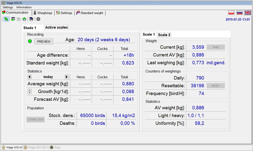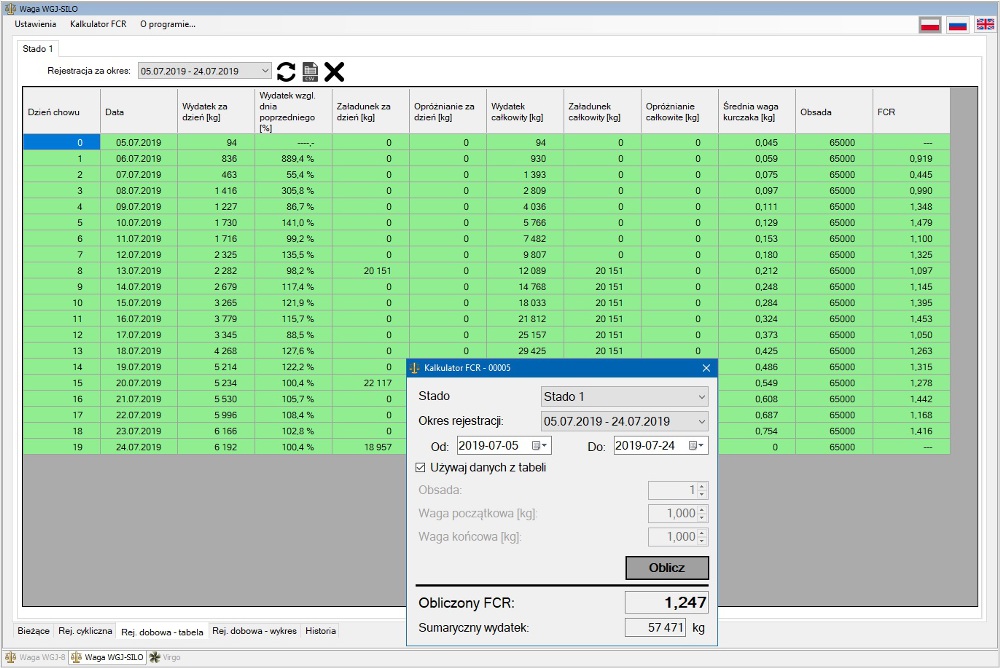 Program WGJ-SILO wprowadzono kalkulator FCR (współczynnik konwersji paszy). Możliwość importu danych z programu WGJ-8C (system automatycznego ważenia drobiu) -umożliwia obliczenie współczynnika FCR na dany dzień gromadząc dane w przejrzysty sposób za pomocą tabeli.