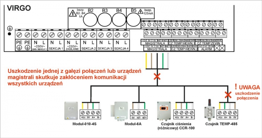 w naszej firmie zostały opracowane moduły rozszerzenia magistrali komunikacyjnej dla regulatorów VIRGO, VIRGO-INL oraz TERMISTAT-6-4S-485-LCD i LCD+. W dotychczasowym rozwiązaniu komunikacji powyższych regulatorów z modułami rozszerzeń (np. 4ZW, INLET-010) oraz czujnikami (np. TEMP-485, RHT-01-GN, RHT-CO2-10k), wszystkie urządzenia pracowały w jednej, fizycznej gałęzi komunikacyjnej. W przypadku awarii fragmentu kabla, czy któregoś z modułów, czy czujników mogły wystąpić zakłócenia w komunikacji ze wszystkimi pozostałymi urządzeniami.